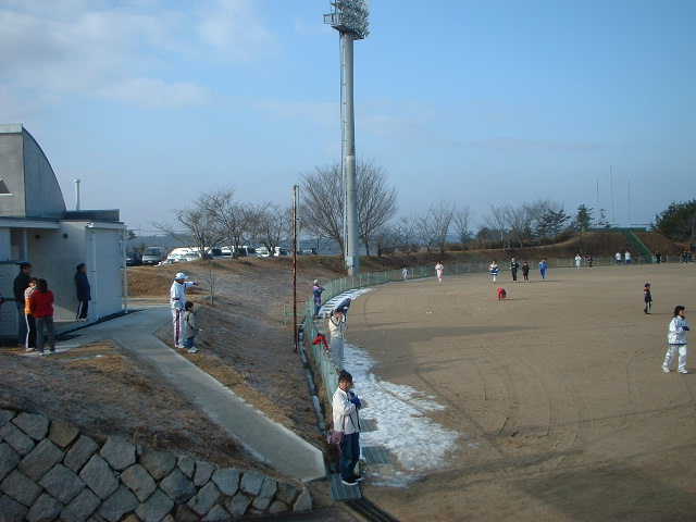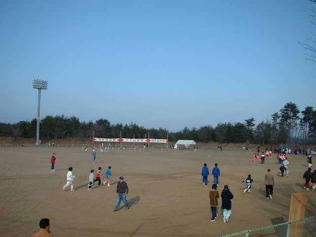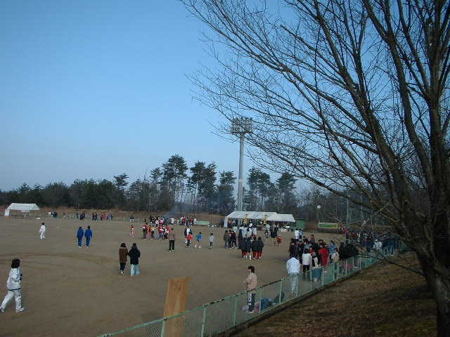 受付けは競技場の手前にある「B&G海洋センター」で行う。 大会記録もそこに張り出される。 競技場には雪が少し残っていた。 雪はコースの途中にも畑にいくらかあった。