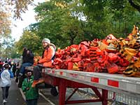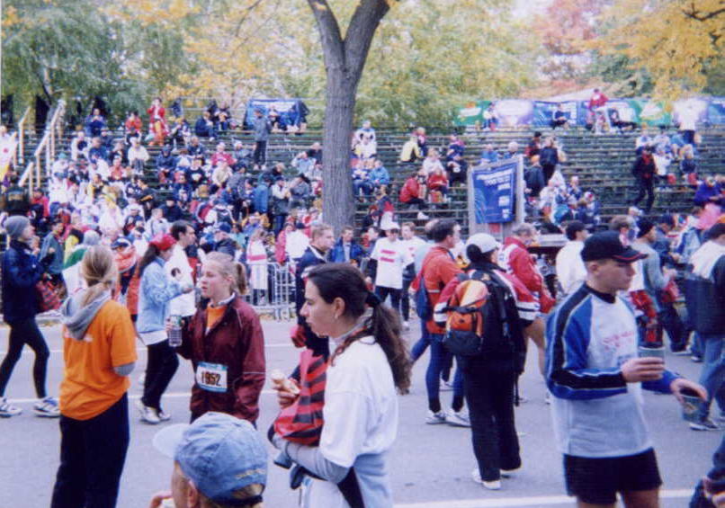 トレーラーが右に左に待っている。その真ん中を選手は前に前に混雑しながら歩く。