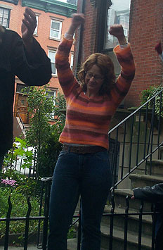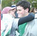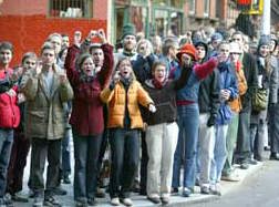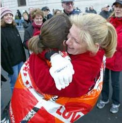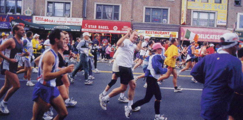 仲間を応援している人は名前を書いた紙やプラカードを持って高く挙げている。そこで歓声、抱き合う。そしてまた走る。