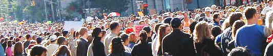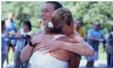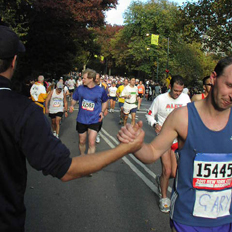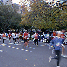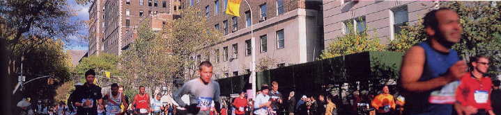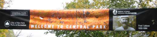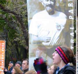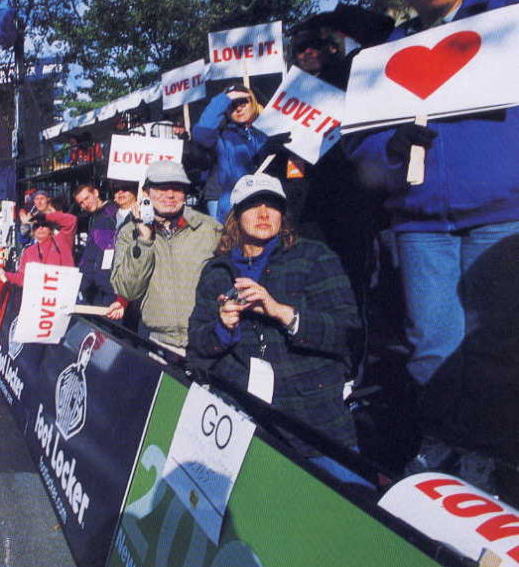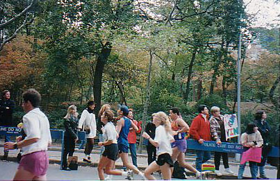 セントラルパークイーストから公園内のフィニッシュまで沿道にはプラカードを持って応援者が続く、抱き合っては分かれている。