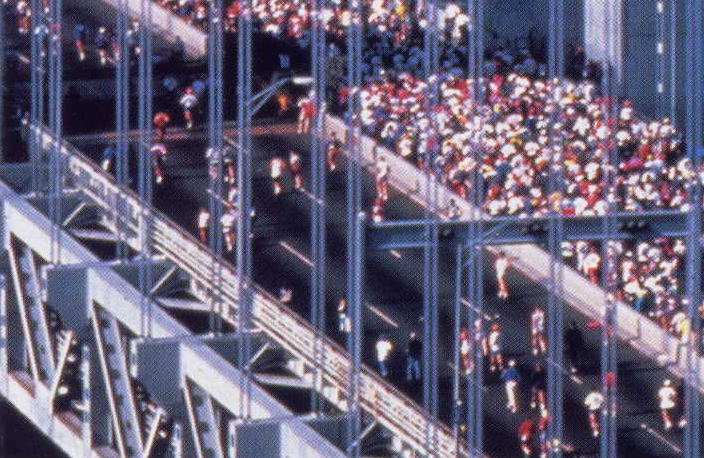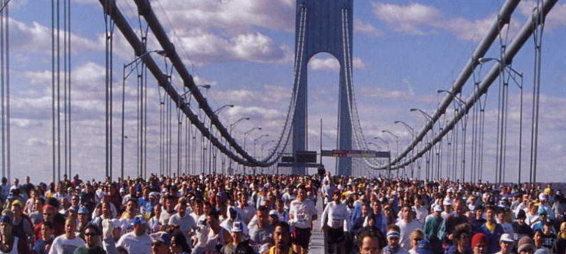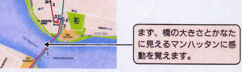 この↑光景にあこがれたのが「NYCマラソン出場決意」の大きな要因だった。 ところがえいちゃんたちグリーンのゼッケンは下段を走った。 これにはがっくりした。 下段の人は参加費35000円を割り引いてほしよ。ほんと。