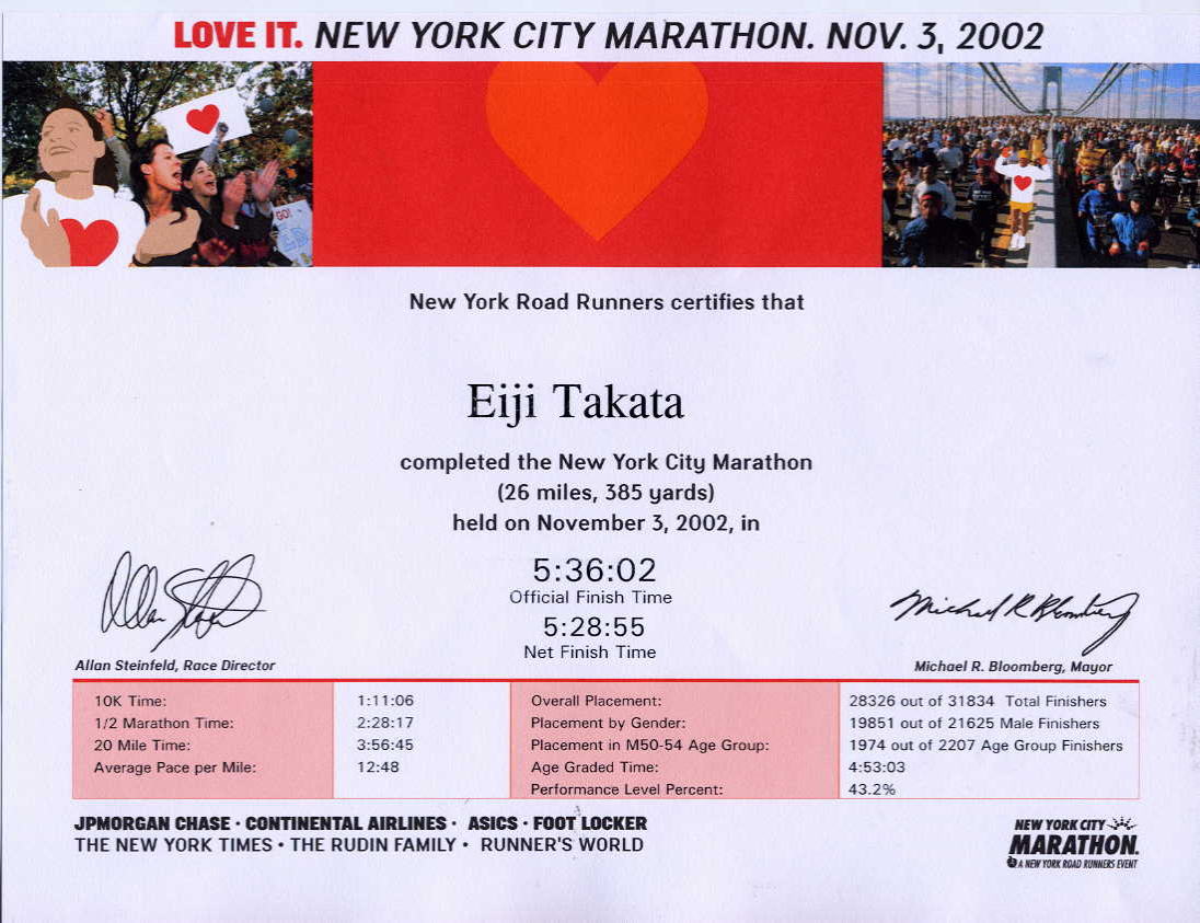 完走証は来年(2003年)の1月頃、全世界の出場選手の自宅へ送られてくる。そういうことで、まだえいちゃんの手もとにない。2002年11月24日