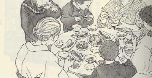 食卓の真ん中には梅干・ママカリの酢浸け・ラッキョウ・味噌などがあった。それは全員のものだった。