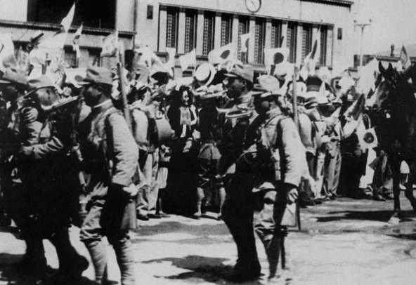 ![]() 赤柴隊は岡山駅から北支へ出兵 |