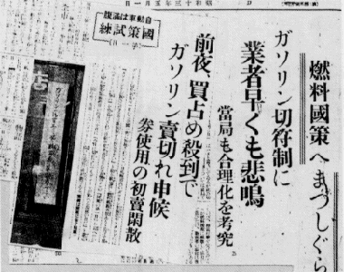 ガソリンの切符制が5月1日から実施された。「けふからは切符(購買券)を持たずには揮発油も重油も買へず交通産業上に未だ経験した事のない強度の燃料統制が行はれるのだ」。「燃料国策へまっしぐら業者早くも悲鳴」 「前夜、買占め殺到でガンリン売切れ申候」と、紙面からも悲鳴が聞こえる。