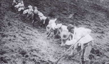 左の写真は笠岡高等女学校の生徒の阿部山開墾。女性も作業参加していた。ことがわかる。