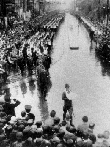 アリューシャン列島アッツ島守備隊(隊長・山崎保代陸軍大佐)2,500人余は上陸した米軍2万人と激戦を展開したが、5月29日夜、最後の突撃で全員散華、傷者は自決した。大本営は発表に当たって初めて「玉砕」の字句を使用した。玉砕将兵は2,527人、うち北海道出身者は864人。写真は小雨のなか、中学生の胸に抱かれ札幌ススキノ4丁目を中島公園の式場に向かう声なき兵士たち