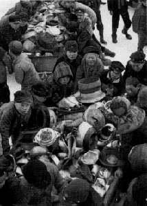 鉄だけてなく、アルミニウムも供出。各家庭から集めたナべ、カマ類を運ぶ 札幌の国民学校の学童たち。