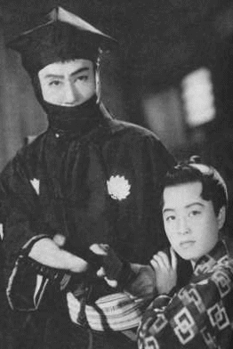 嵐寛寿郎の鞍馬天狗は映画の中だけでなく、漫画、ラジオ、読み物、パッチンなどあこがれのものだった。 どうにかしてあの黒頭巾の真似をしたいものと、家の風呂敷を頭にかぶせたが、どうしてもそれらしいところにはできなかった。 それは何回も試みたが毎回同じ結果であった。 |