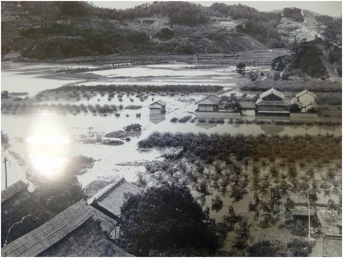 茂平の水害 江戸時代の干拓地の茂平は、大雨が降るとすぐに沼るでなく すぐに大きな湖になった。 特に雨台風の時はそうだった。 大きな湖化した畑や水田への行き帰りは海の干拓堤防を大回りしてした。 それは昭和35年頃まで、つづいていただろうか? 所蔵・笠岡市生涯教育課