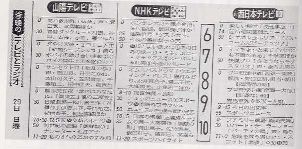 テレビはこの3局のみ。(NHK教育も写ったかもしれない。学校以外で見る人は誰もいなかった。) プロ野球中継は@読売系の西日本でさえ日曜日に巨人をしていない。 A西鉄・東映・南海・大毎の球団はすべて経営が変わっている。2001年1月7日 作者記