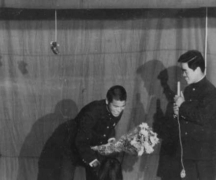 一年の時にクラスからは私と、後に日活映画に出演するU君がでた。 U君は西郷輝彦の「君だけを」、私は井沢八郎の「男傘」であった。 講堂の舞台に上がるとあがってしまい、声がうわずってでなかったが自分から客方面に投げ他たテープがうけて印象をあげたのがわかった。…おお〜と〜こ、が〜さ〜