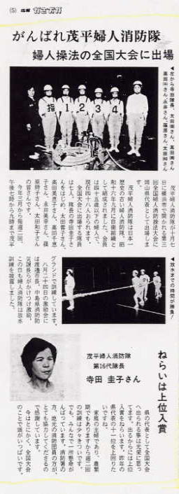 婦人消防隊は茂平運動場で男子の指導訓練を受け、 男がコーチせにゃあ何ができりゃあ。 茂平グランドで。 市からは制服を新調してもらい全国大会にいった。