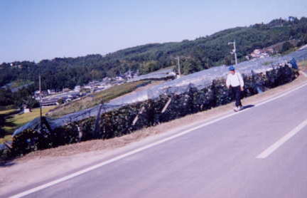 今朝は寒く手がこごえた。それは日中の快晴のあかしでもある。 青野小学校の受け付け時間は8時から9時半まで。 えいちゃんが立てた作戦は、初出場のこの大会のコースの下見もかねて早く着く。スタートまで2時間ちょっとあるので一度歩き走りしながらコース体験をする。 家を7時50分頃に出て8時10分頃に着いた。当然第一駐車場である学校に駐車。すぐ受付を済ます。ちいさな学校だ。校庭も狭い。 受付でもらったTシャツ・名簿などが邪魔なのでひとまず車に戻ってのした。名簿の本でコースをみたが小学校からどういくのかわからない。 で、コース下見はあきらめる。 妻から彼岸の添え物に”葡萄を買って帰って”といわれていたので、葡萄を買いに会場のテント村を見た。葡萄は売ってなかった。 聞けば「ここから500m離れた浪漫館で売っています」とのこと、そのうち放送が”今年は会場では葡萄の販売はしておりません、お求めは・・”と、繰り返し案内している。 青野小学校から葡萄浪漫館まで歩いていく。 なだらかな丘陵はブドウ畑一色。頭だけにビニールを載せ、葡萄の実には袋をかぶせている。袋は下半分が開くのでなく、桃などのように閉めた袋をしている。 それにしてもみごとなまでに葡萄畑が連なっている。 |
