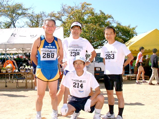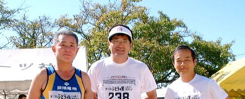KSD軍団と話していると、早足で知られるRD社のじつもり選手の顔が見える、早速挨拶に。 じつもり選手はスタート40分も前だというのに、早くも顔から首から腕から大汗。 RD社の社名入りのランニングシャツで決めている。 じつもり選手の快速ぶりは矢掛マラソンで目の当たりにしたことがある。その時、想像できない早足ぶりにびっくりした。その事をいぬい先生に言うと「じつもりさんははやいですよ」と先生も認めていた。