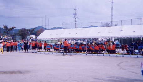 開会式は9時から。 空に花火が打上げられた。どお〜〜ん。 地元高校生(学校名は忘れてしまった、来年はちゃんと覚える。)による演奏開始。 関係者挨拶、平沼大臣の長ったらしい祝電、招待選手紹介が行われた。 招待選手は天満屋女子選手のユニフォームがあか抜けていた。 |
