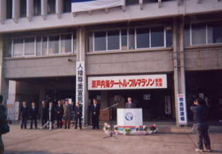 開会式は町長・県知事代理の挨拶をを除き簡略されたものだった。 他に議長その他来賓挨拶、紹介すらない。 政治家などの祝電紹介はもちろんない。 競技説明の人が言っていた「この大会は、死ぬまでに一度はフルマラソンを走りたい人のために始めた大会です。」という当初の趣旨が生きている。 地元選手による 《選手宣誓》。この宣誓のことばもよかった。