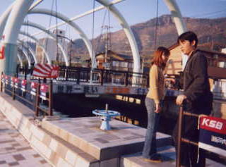 スタート地点の土庄役場まで自転車でま行く。 旅館から2キロほどの距離だった。 役場の前は観光スポットの”世界一狭い海峡”があった。 会場にはおおきな「スタートゴール」のアーチ。 「完走おめでとう」の横断幕。 テント村が出来てその周辺は朝日新聞・日刊スポーツの旗が並び、ついでにという感じでKSB・瀬戸内海放送の旗。