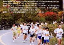 コースの途中途中にはポールが立ち朝日新聞・日刊スポーツの二つの旗がかかげてある。 だいぶんつかれてきたので距離標示はないかときょろきょろしながら走る。 ついに見えた標示は裏返しの「残り6キロ」のタテカン。 なっ、なにぃ。まだ6キロ! がーん。 この頃からえいちゃんはあせり始める。 また山を上る。下る、漁港。またまた山を上る、下る。そしてまた上る。 10キロ標示を過ぎてほどなくしていっぷく。そこで折り返し下りることにした。
