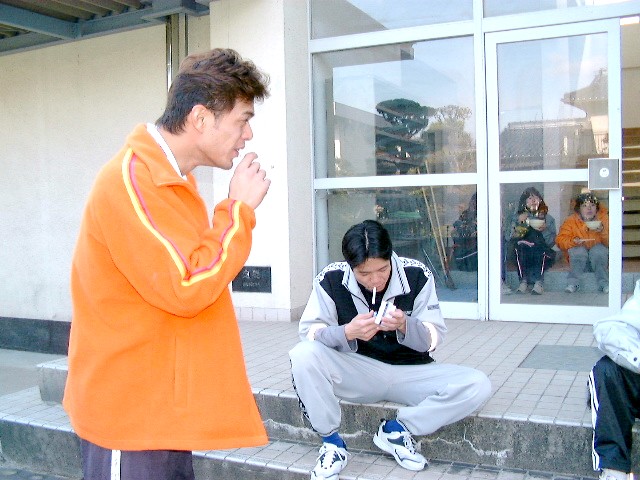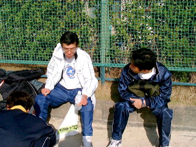 うどんを食べた後、いっぷくする岡本・荒木 いっぽう惨敗でシュンタロウのえいちゃん、と副部長。 「村ちゃん、今日で区切り。フルの練習に切り替える。」その声も弱弱しい。