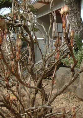 | もぅ少し春らしいのはないかと見れば、ボタンは大きくふくらんでいた。 このボタンは手入れはしていないが、毎年わくわくするような見事な花を咲かせてくれる。 |