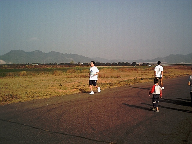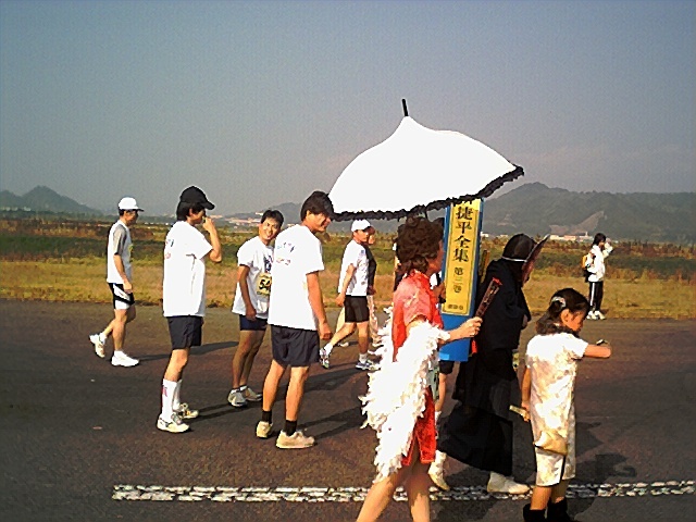 1キロ過ぎて昔の老女姿のランナーと並ぶ。