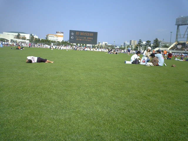 あまりの暑さにシューズにつけているチップをはずすのがしんどかった。 それで芝生に寝転んだ。 ふー、 ひと休み。 ええ気持ち。 |