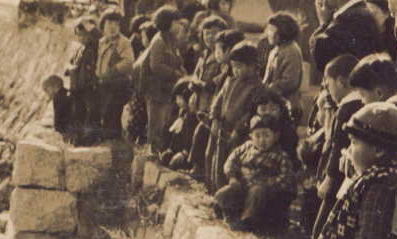 | 茂平の水門には神島から花嫁が来た。船から下りようとする花嫁と、その上には子供達の見物があふれ。 | ||
